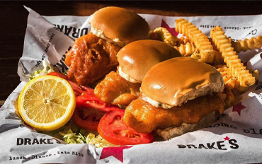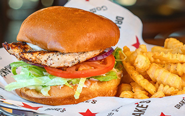 Choice of southwestern chicken breast or Drake's All-American Lager-battered white fish served build-your-own style with soft flour tortillas, sautéed onions & peppers, & all the fixins 16.49
