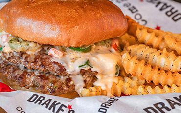 DRAKE'S PROPRIETARY BUTCHER BLEND GRIDDLE-SEARED & FULLY COOKED ON A BUTTER-TOASTED BUN WITH CHOICE OF SIDE